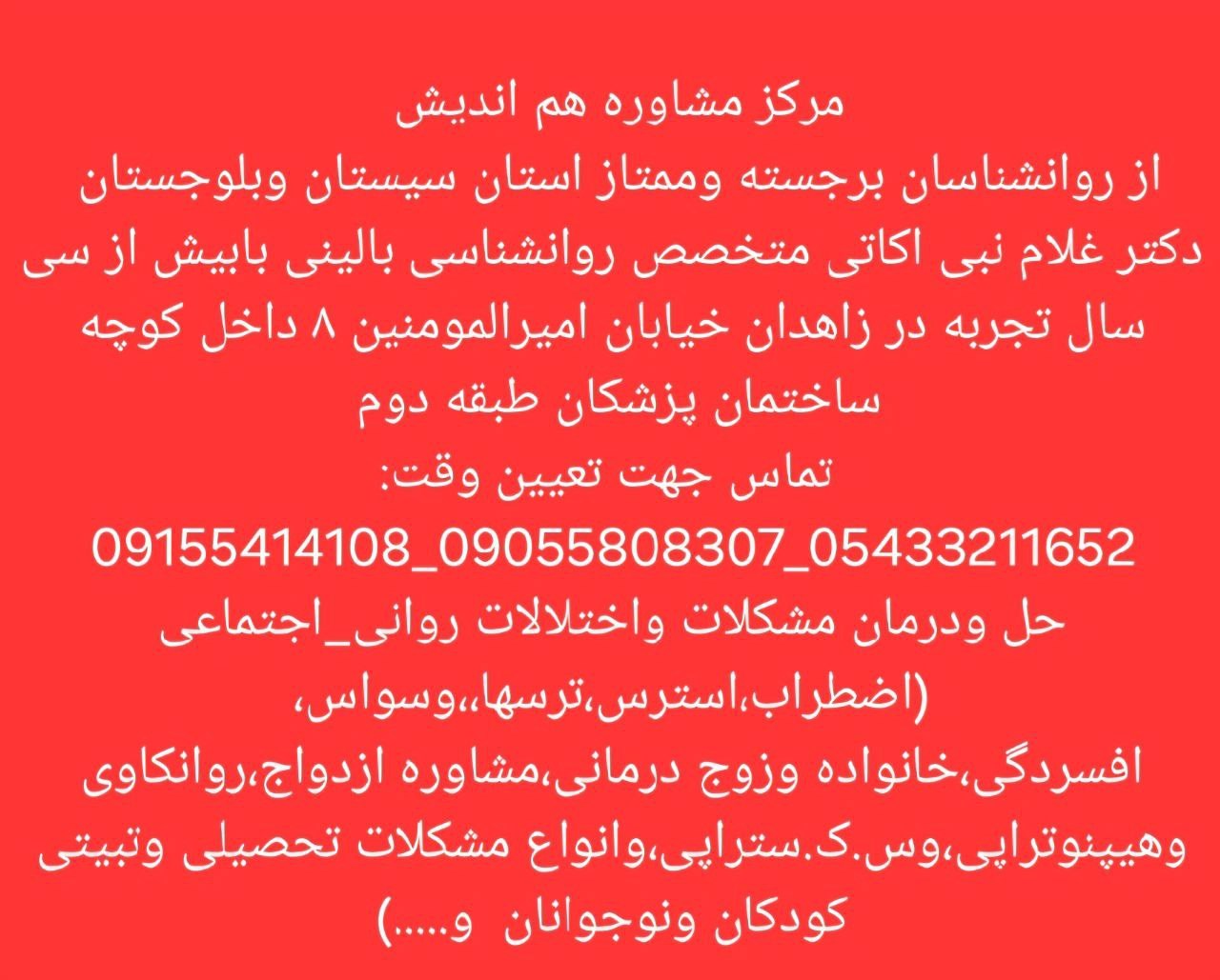 آدرس: زاهدان، خیابان امیرالمومنین ۸،داخل میلان، ساختمان پزشکان، طبقه دوم، مرکز مشاوره هم اندیش